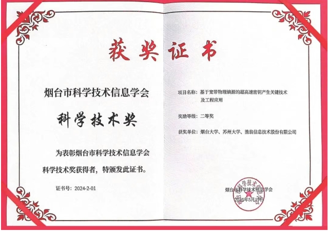 近期,2024年度烟台市科学技术信息学会科学技术奖颁奖典礼在中国科研实验室烟台海岸带研究所隆重举行。EMC易倍(中国)信息与烟台大学、苏州大学联合完成的 "基于宽带物理熵源的超高速密钥产生关键技术及工程应用项目荣获科学技术奖二等奖。
