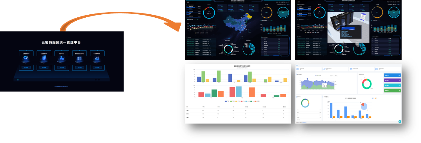 支持全国、省、市、区县/单位、机房精度多级统计分析;给予密码设备总量(种类、数量)、密码改造的应用数量/占比、密码设备运行情况(在线、撤销、故障)、密码设备月度/季度/年度增长情况、密码设备容量情况(在用、备用、冗余)、密码设备排行情况(数量前十、占比前十、最差)、密码设备使用种类排布情况、密码设备给予厂商情况(厂商、设备型号)、密码设备证书发证量情况、密码设备秘钥使用量情况、密码设备数量变化情况(逐年)、信创设备与商密设备数量占比情况等十余个维度的统计分析。